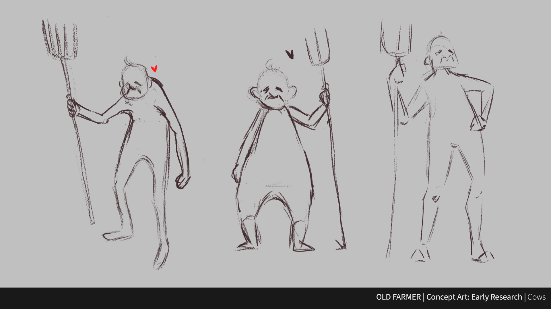 Our main character, she is a young cow made out of clay. We wished for her to reflect this idea that she could be made by hand, and included a few DIY elements on her body (ears and tail). We had to find the balance between making her someone we could see as our main character and that would detach herself from other cows while keeping in mind our team’s abilities and needs in 3D. She needed to look pliable enough but couldn’t give too much trouble to our sole rigger. An extensive back an forth process but worth it in the end!